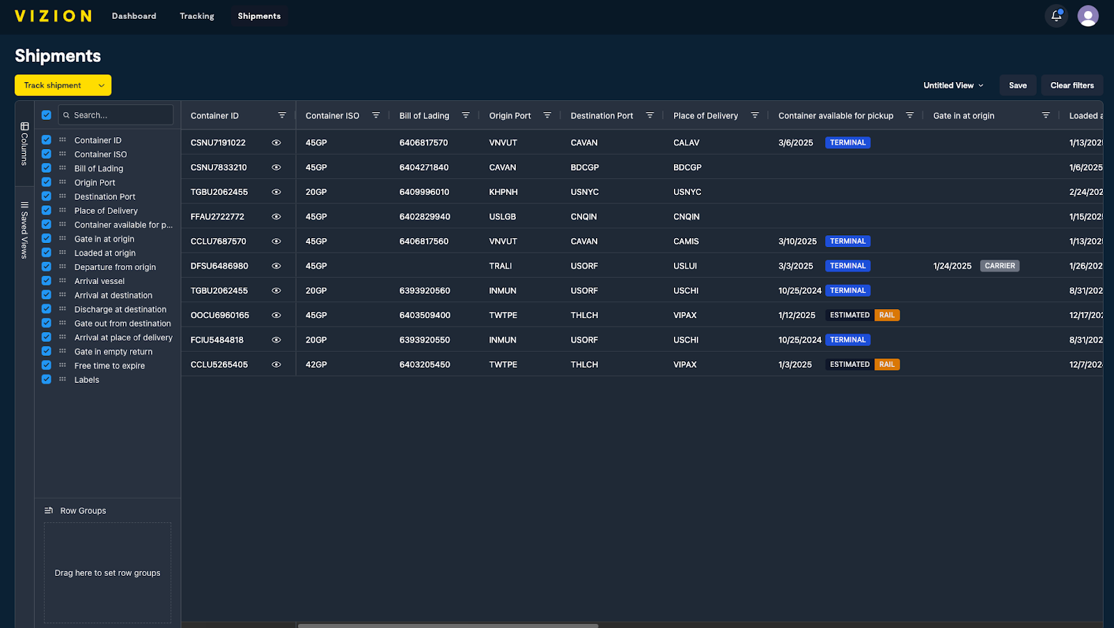Row Groupings - Users can group shipments into specific categories based on their operational needs. Grouping shipments allows for a clearer overview of specific categories, making it easier to track priority shipments, carrier performance, or trends in the data. Ways to create row groupings: