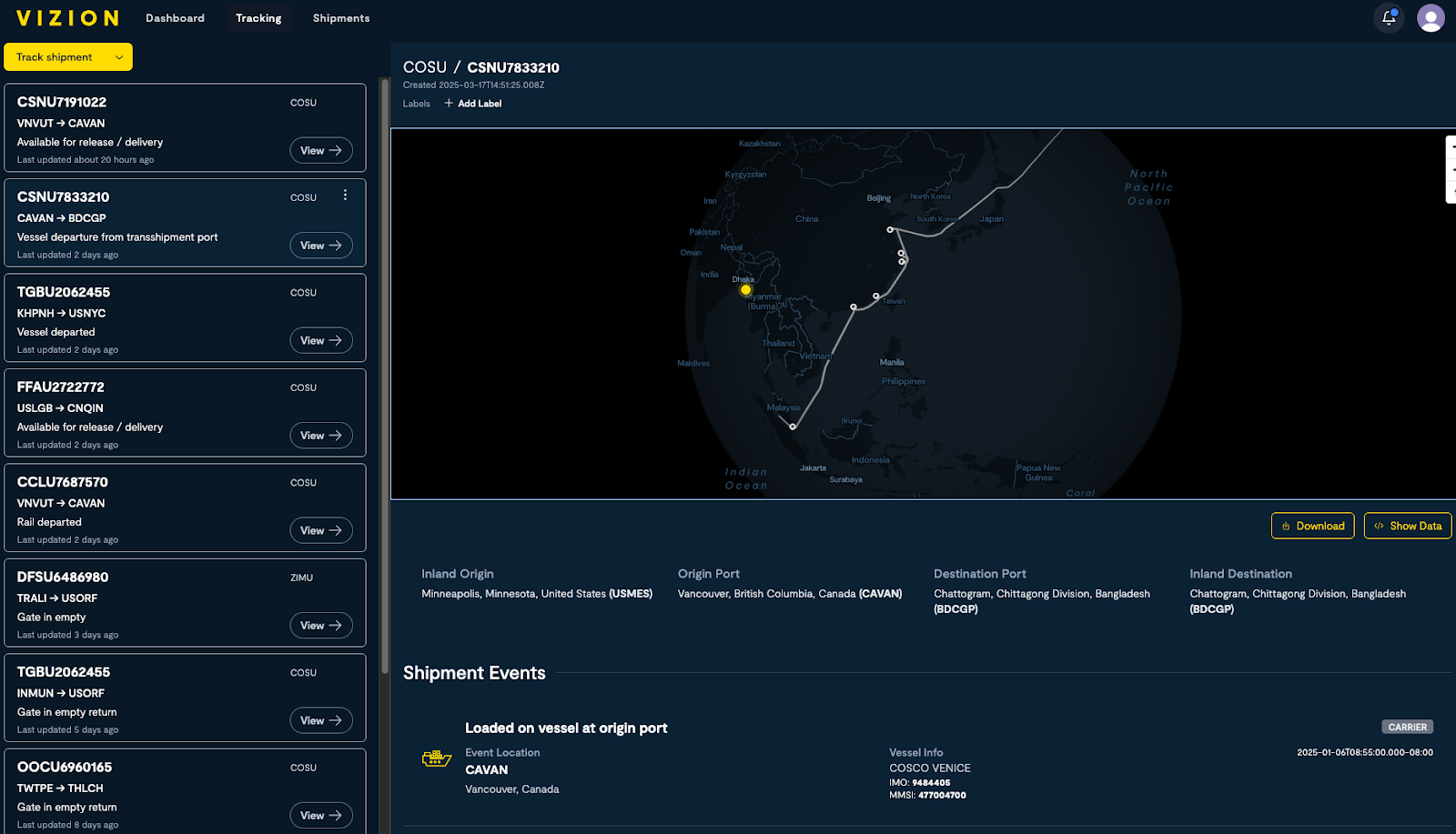 - Individual Shipment Milestones: Standardized tracking milestones covering the entire container journey via sea and rail(e.g. Loaded on vessel at origin port)